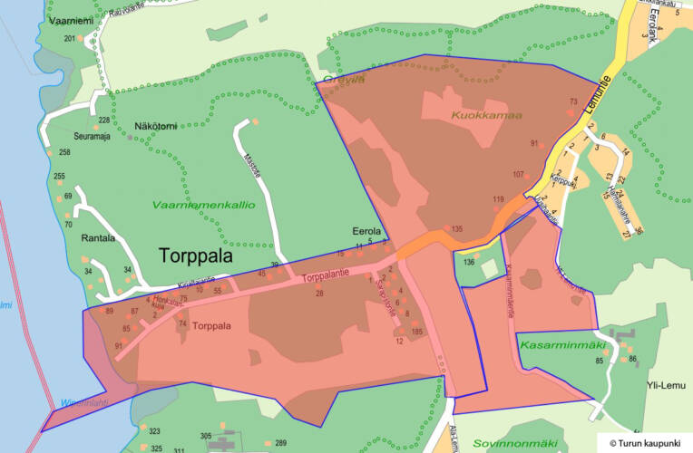 Lemunniemellä on vireillä kaksi eri asemakaavaa: Torppalan ekokylän ja Yli-Lemun puistotien kaavat. Torppalan ekokylän asemakaava on pilkottu kahteen osaan, joista Torppalantien ympäristön käsittävä osa on parhaillaan kaupunkikehityslautakunnan käsittelyssä. Kaava-alueet on merkattu karttaa punaisella. Kuva: Turun seudun karttapalvelu.