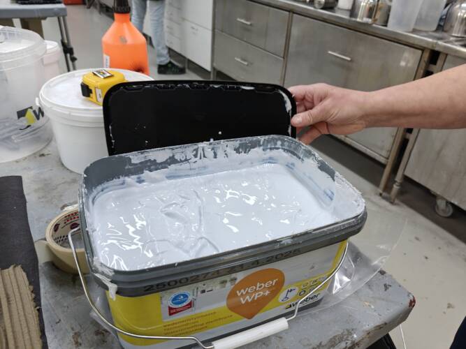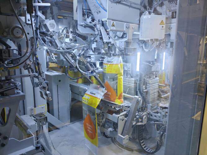 Pakkauskoneen ikkunasta näkyy, miten robotti täyttää muovisia pusseja Weberin Supra Light Fix -kiinnityslaastilla. Tyhjä pussi heilahtaa robotin otteessa, täyttyy salamannopeasti ja on nytkähtänyt eteenpäin liukuhihnalla. Robotti on pyörähtänyt ottamaan uuden tyhjän pussin vastaan. Näkymä on kuin tieteiselokuvasta.