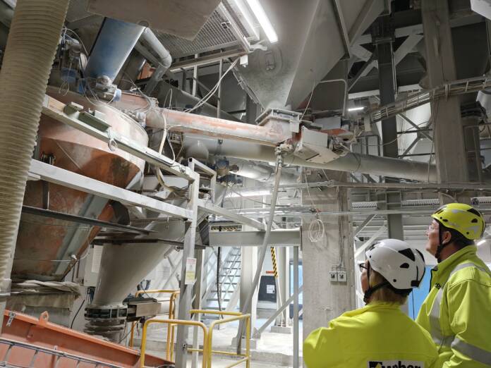 Sisällä jylisee, kolisee ja humisee. Turvakaiteet ja -maalaukset ohjaavat kulkijoita. Yläkerroksen valtavista siiloista annostellaan alas kalkkia, hiekkaa ja satoja muita raaka-aineita sekoitettavaksi.