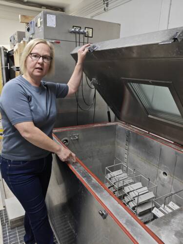 Pakkasarkussa 20-asteinen laastikappale on jäähdytetty kahdeksi tunniksi 15 pakkasasteeseen. Sen jälkeen päälle lasketaan 20-asteista vettä. Laite toistaa tätä sykliä kymmeniä kertoja, jotta tuotteiden tiedetään kestävän Suomen oloissa.