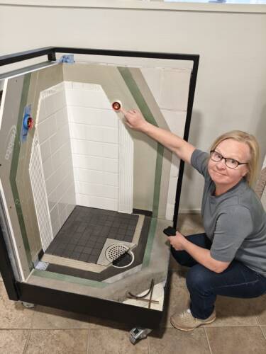 Kehityspäällikkö Sari Aarnio avaa oven matalasta sivurakennuksesta. Juuri siellä on yhtiön Akatemia, jossa koulutetaan asentajia ja suunnittelijoita käyttämään Weberin, Isoverin ja Gyprocin tuotteita.
